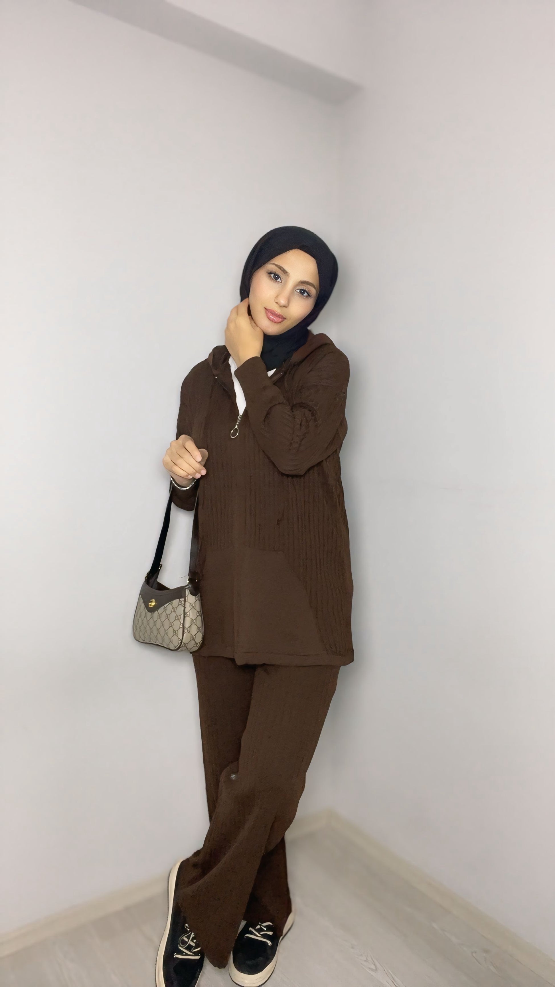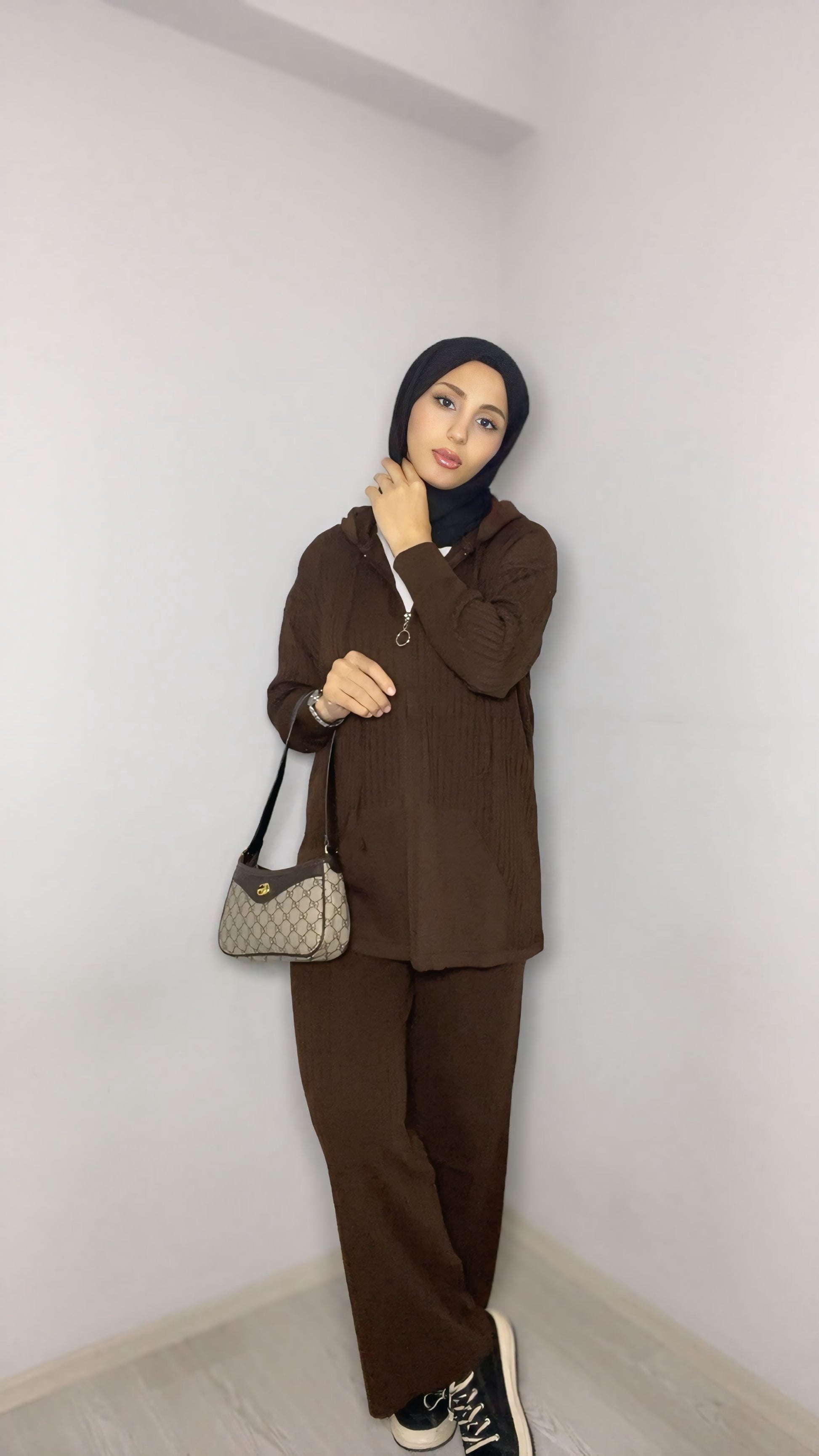 Doğal tonları ve rahat kesimiyle öne çıkan kapüşonlu kahverengi tesettür takım, günlük şıklığı konforla bir araya getirir. Salaş yapısı sayesinde hareket özgürlüğü sunarken, modern kapüşon detayı ile sportif ve şık bir görünüm sağlar. Günlük kullanım, şehir hayatı ve hafta sonu kombinleri için ideal bir tercihtir.