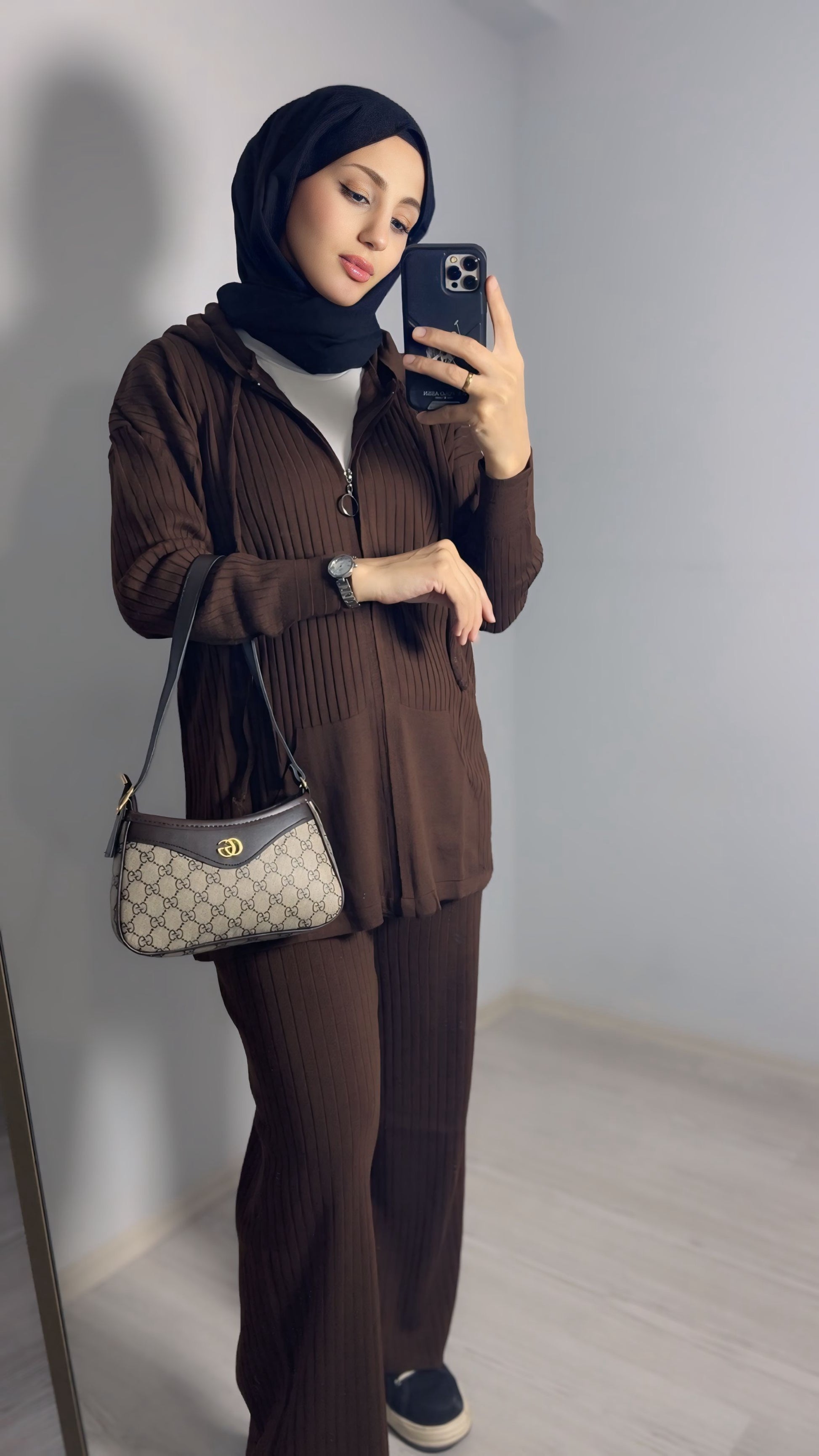 Zamansız kahverengi rengi; siyah, bej ve krem aksesuarlarla kolayca kombinlenebilir. Tesettür giyimde rahatlığı ön planda tutan kadınlar için tasarlanan bu takım, tesettür takım, kapüşonlu tesettür kombin, rahat kesim tesettür ve günlük tesettür takımları aramalarında öne çıkacak şekilde SEO uyumludur.